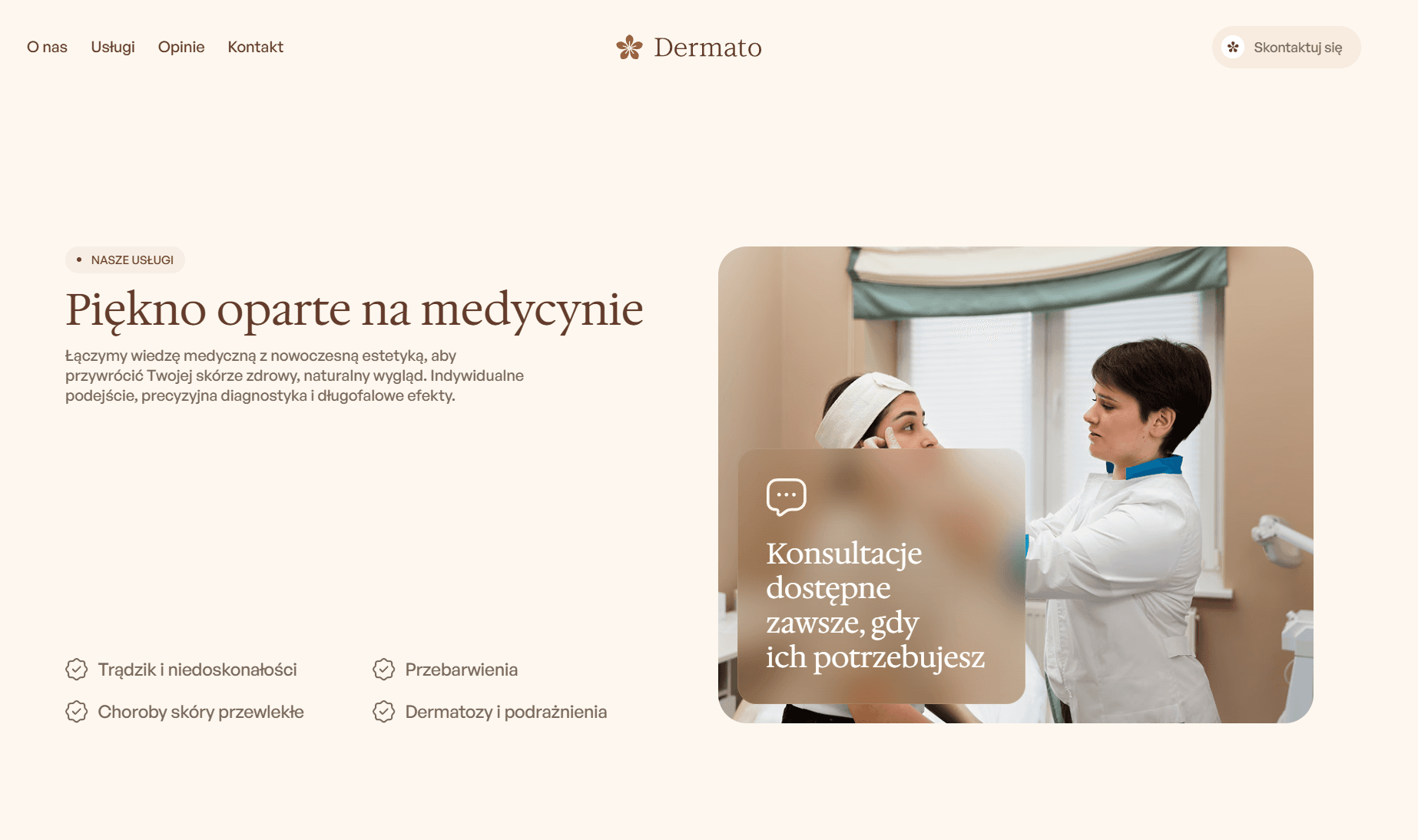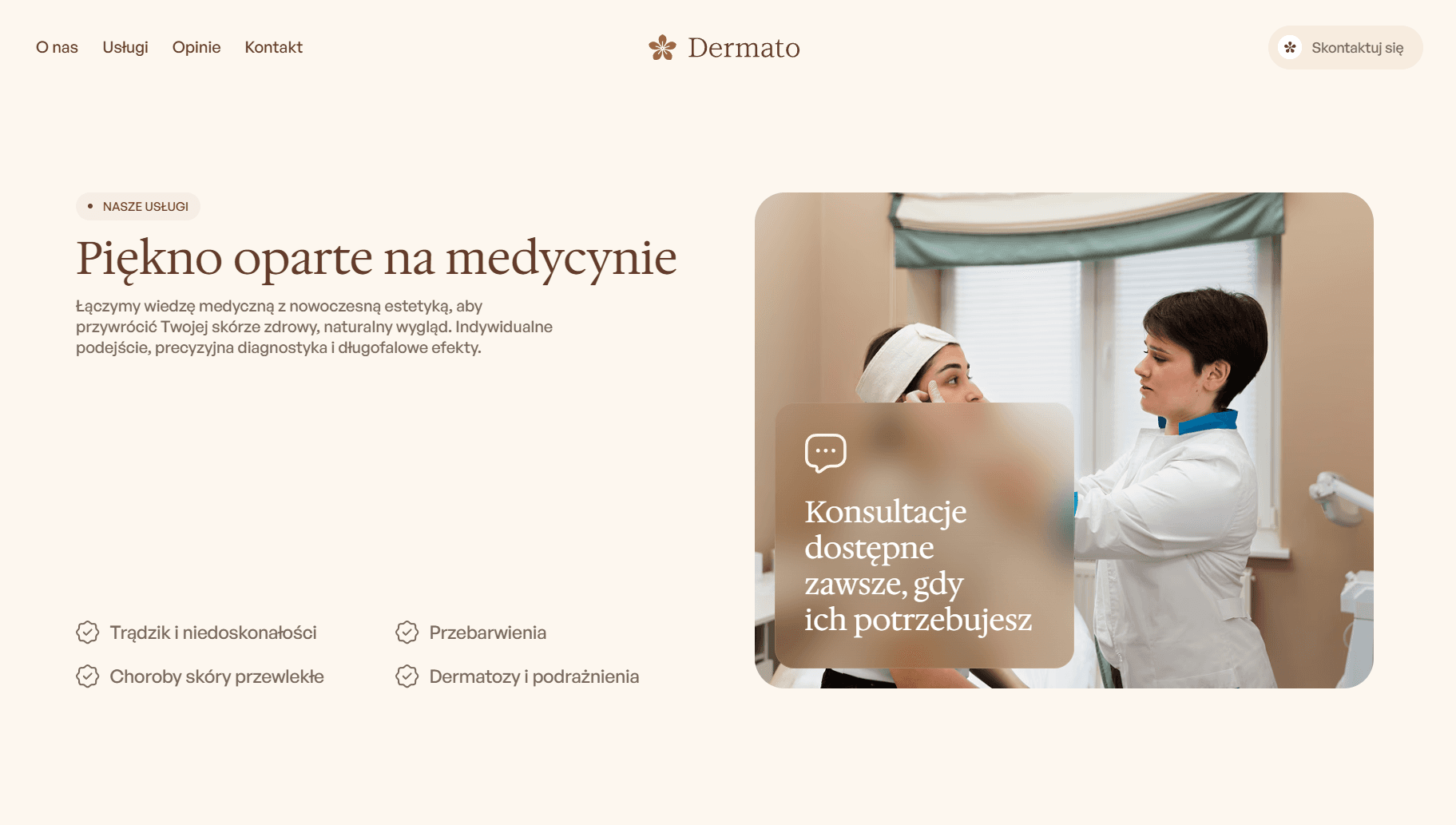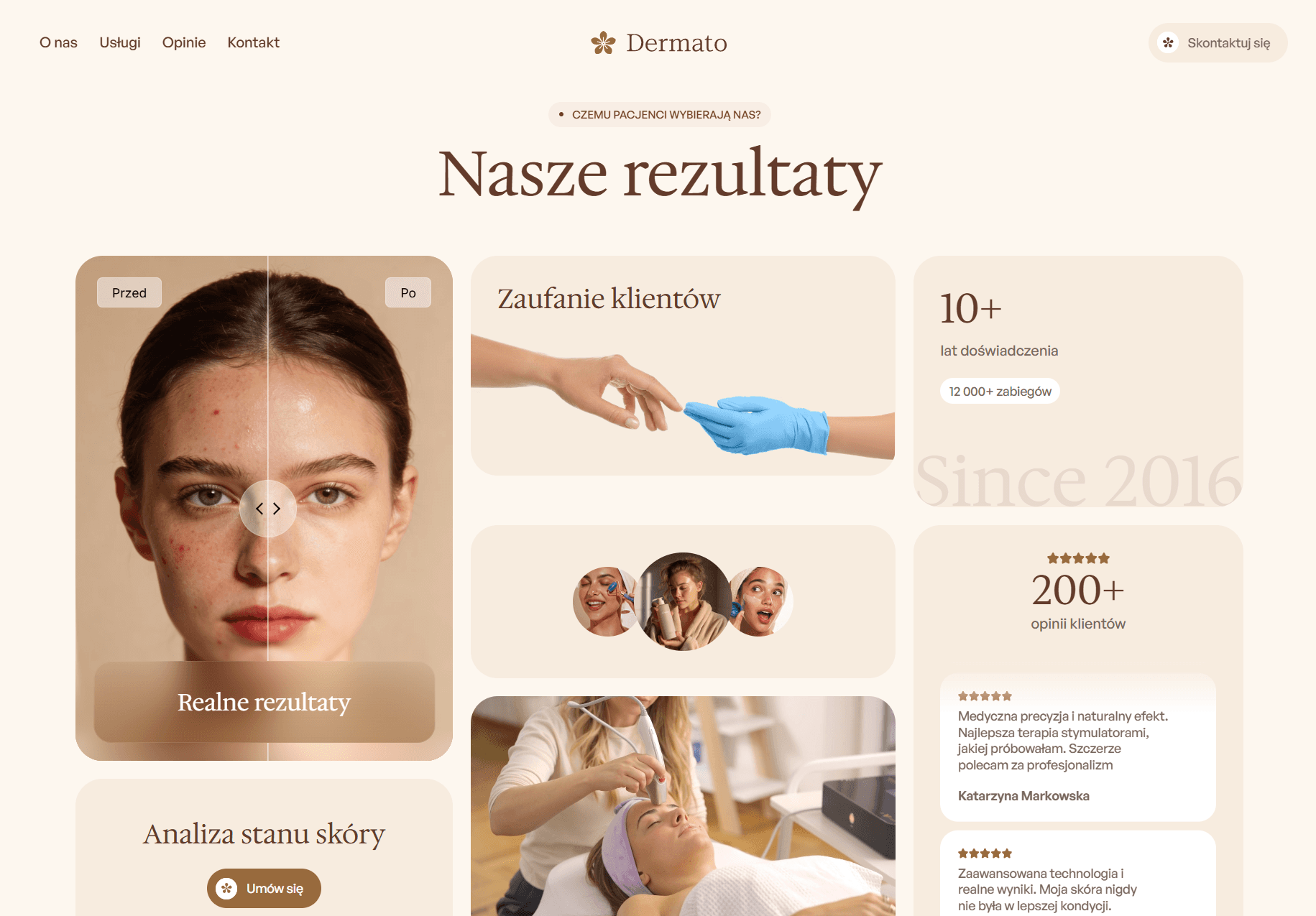 Dermato to projekt stworzony z myślą o tym konkretnym problemie. Zaprojektowałem stronę, która wygląda tak dobrze jak sama klinika, elegancka, nowoczesna i prowadząca użytkownika prosto do rezerwacji.